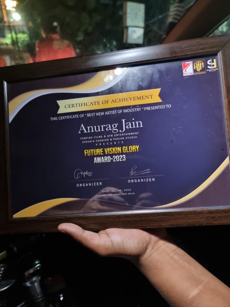 Fourth Award I was Awarded trophy for the Best Actor Model in Songs by very famous bollywood Celebrity Actress Nushrat barrucha specially for my song as Main leading actor in hum khud hi chale jayenge tera sheher chhod के and for the fantastic acting performance in that song and also for my song Teri akhiyo se Akhiya mila ke as main leading actor and singer writer composer and certificate for the Best New Artist of industry for my all Roung talent ability like singer writer composer and Actor and poet
